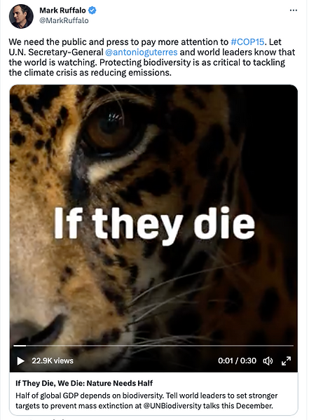 Good Will Ambassadors who endorsed COP15 among many others are Leonardo Di Caprio, Mark Ruffalo, Antonio Banderas, Hindou Oumarou Ibrahim, Dia Mirza, Greta Thunberg, UNEP Regional GWA (Catalina Robayo and LiBingBing), UNESCO Regional GWA (Maya Gabeira) and WWF Regional GWA (Ivan Lalinde and Natalia Reyes).